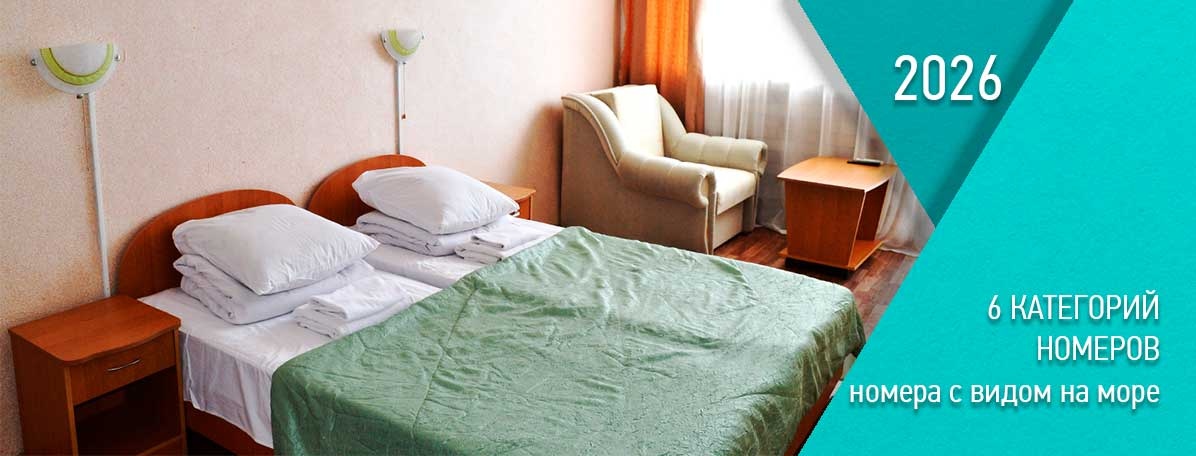 Отель предлагает размещение в номерах шести категорий: двухместные стандарты (без кондиционера, вентилятор по требованию), двухместные стандарты с кондиционером, трехместные стандарты с кондиционером, двухместные улучшенные, двухместный двухкомнатный улучшенный и двухместный студио. Все номера с балконами, обращены к морю. В хорошую погоду на горизонте видны волшебные очертания гор восточного Крыма.