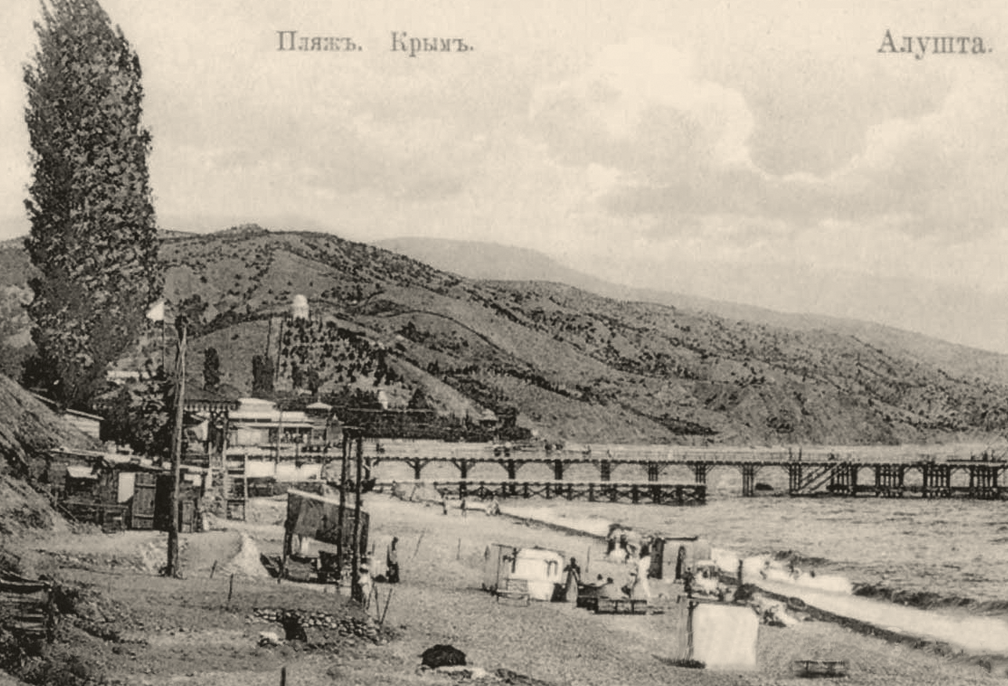 "... вдали на окраинѣ нрозрачнаго, голубого небосклона ярко выдѣлялась темносиняя искрящаяся полоса моря, окаймленная стройными тополями. Это была уже Алушта. Замѣчу кстати, что въ настоящее время этихъ тополей, составлявшихъ украшеніе Алушты, уже не существуете: въ 1893 г. ихъ смыло силыіымъ приливомъ воды.